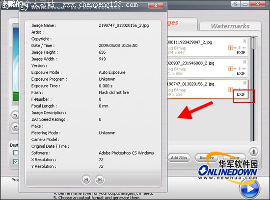 图4 图片导入到软件当中以后,单击图片缩略图后面的“EXIF”按钮,即可显示数码照片的EXIF信息。如图5所示。