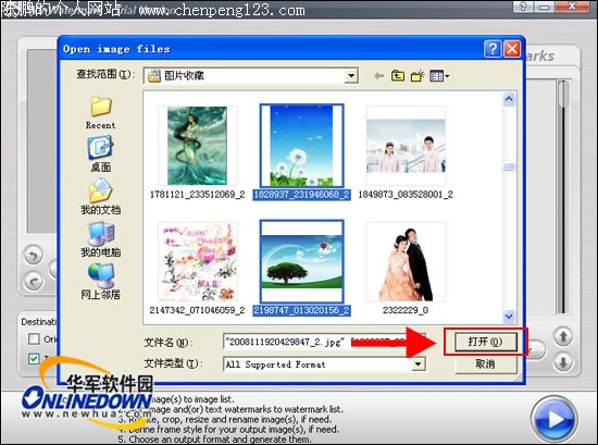 进入软件的主界面以后,单击界面右侧下方的“Add Folder”添加文件夹按钮来进行批量添加水印;也可以单击“Add Files”添加文件按钮,为一张或多张图片进行添加水印;在这我们单击“Add Files”添加文件按钮,在打开的窗口中选择要添加水印的图片,然后单击“打开”按钮。如图4所示。