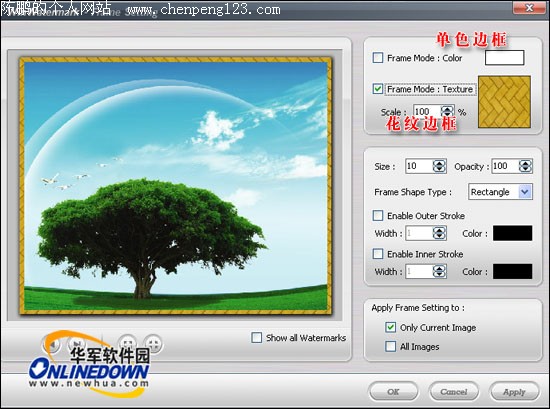 图8 也可以为照片添加边框,单击“Frame”按钮,在打开的新窗口中可以为照片添加单色边框和花纹边框,还可以设置边框的大小,透明度等。如图9所示。