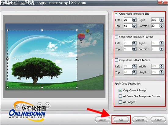 可以通过预览图片下方的几个按钮对图片进行简单的处理;单击预览图片下方的“Crop”按钮对图片进行裁切;可以在打开的新窗口右侧输入精确数值进行裁切,也可以用鼠标拖动左侧预览窗口中八个小方框,来对图片进行任意裁切。如图7所示。