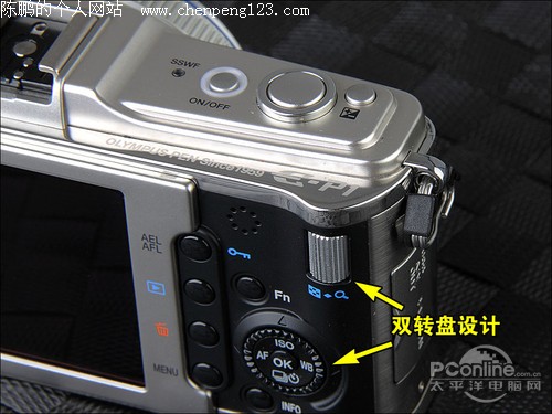 用于调整各项参数的多功能转盘在单反相机上常见,而在这种可换镜头DC上同样见得到,奥林巴斯E-P1采用双转盘设计,主转盘刚好在拇指位置,使用方便又舒适,但与五维键整合的另一个转盘,在实际操作的时候并不顺手,同样需要使用拇指去调节,但是会影响到持机的手势,对于重量不轻的E-P1来说,这种设计并不算太好。