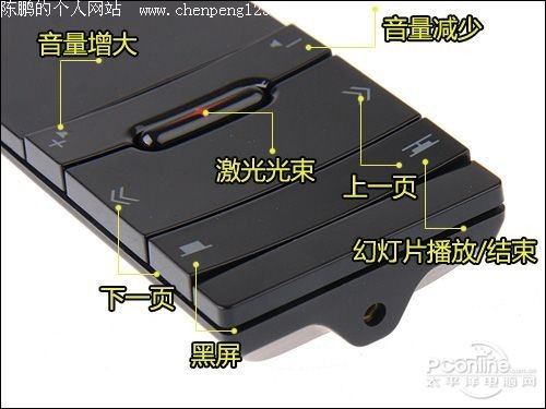 雷柏2300Sky 2.4G无线演示控制器的核心功能,即PPT控制按键位于演示控制器上侧,分别有音量控制、PPT幻灯片页面切换、PPT展示时的黑屏功能以及幻灯片开始播放/结束播放的按键,中间的红色按键就是激光光束的发射按钮。6个控制按键能基本实现了PPT演示时的控制,起到代替鼠标使用的效果。 |