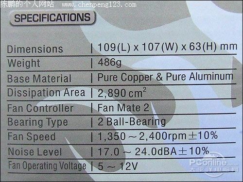 参数表格一览 风扇也是风冷散热器的重要组成部分,ZALMAN CNPS700-AlCu采用了全黑色的风扇,而在各位关心的转速以及噪音方面,风扇转速为1350 ~ 2400 ±10% rpm,工作噪音为17.0 ~ 24.0 db±10%左右,很安静。