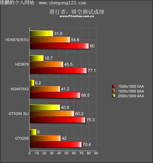 《潜行者:晴空》是一款DX10.1游戏同时它还是一款对显卡要求极其苛刻的游戏,特别是在对显卡显存方面的要求更甚,这一点我们从2560x1600分辨率下的成绩也可以看出,因此我们看到HD5970虽然在关闭游戏抗锯齿下领先GTX295 SLI但是在8倍抗锯齿和高倍分辨率下的成绩则要略落后于GTX295 SLI。 |