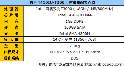 方正T410IU-T300AQ采用14英寸宽屏幕、配备了Intel赛扬 T3000双核处理器(1.8GHz主频/1MB二级缓存/800MHz前端总线)、Intel GL40+ICH9M芯片组、1GB DDR2内存、160GB硬盘、DVD光驱和Intel GMA 4500M集成显卡。目前,它的经销商报价为3167元。