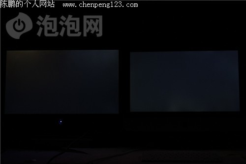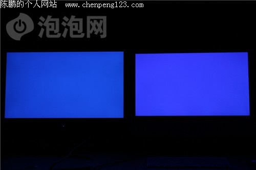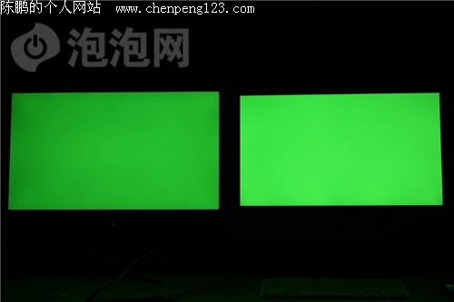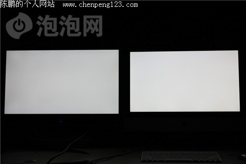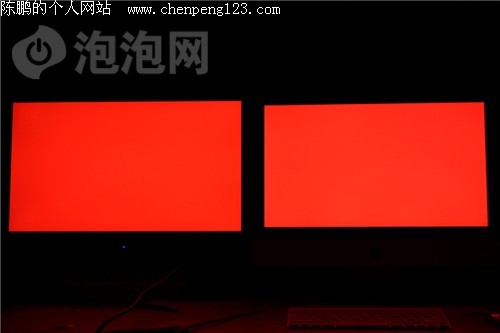● 基础性能对比测试:差异明显 测试前,我们已将两台显示设备的性能调至最佳状态,其中亮度都是最大的100%,iMAC的色温为sRGB,而AOC iF23 R.G.B三项数值都调整为100。 以下测试中,左侧为AOC iF23,右侧为iMAC ★ 漏光测试/黑度均匀性