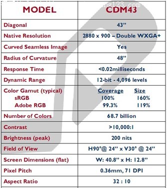 很容易看出对于这款2880×900像素的43吋桌面显示器来讲,其产品属性相当高阶。该CRVD的顺利曲率连同其生动的LED颜色,0.02毫秒的响应时间划清了与普通显示器的界限。 性能方面,Ostendo CRVD曲面显示器响应时间小于0.02ms,它的像素间距为0.36mm,色彩动态为12bit,Adobe sRGB色域覆盖达到99.3%,对比度达到10000:1,亮度为200nits,支持DVI-D/HDMI输入。从产品规格中了解到,它后置有4个USB输出/1个USB输入接口。 它采用最新的LED技术,提供明亮,可用于图形和视频工作。该CRVD在低于0.02毫秒的响应时间速度飞快,因此没有在移动图像和动画鬼影。同时产品还没有特殊的硬件或软件的需要,兼容性非常强大。 ● Ostendo CRVD获得过的殊荣