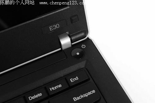 右上角的电源开关按键 看完了键盘,我们再来看看键盘以外的其他细节部分。虽然这款联想ThinkPad Edge的转轴采用了不同于以往的塑料材质设计,但是安全性上倒是没有任何问题的。