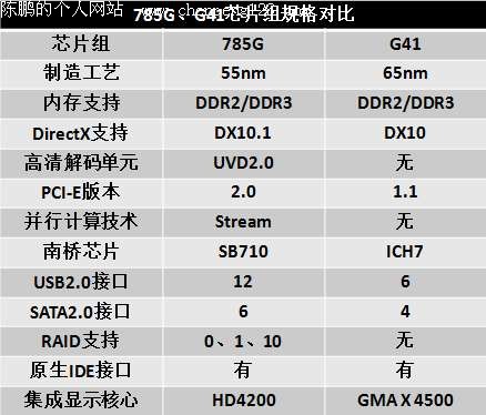 搭配G41/785G最多 整机性能跟搭配的主板有很大关系,还是因为售价原因,Intel/AMD两平台出货量最大的分别是G41/785G芯片组。我们先来看看G41和785G芯片组的规格对比: