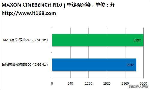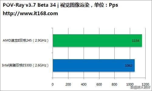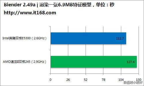 和影音转码性能测试一样,3D渲染性能测试也是以AMD速龙II双核245三比一取胜Intel奔腾双核E5300告终,Blender渲染和苹果iTunes 9音频转码一样一直都是Intel处理器的强项,连高一个定位AMD产品都没机会。 |