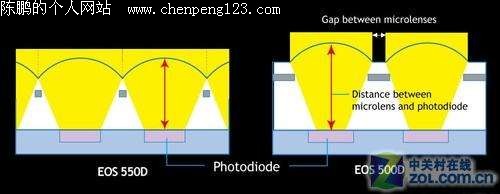 佳能550D传感器结构分析 话分两头说,到了单反相机领域,似乎情况就有所变化了。2010年佳能单反相机头炮——同样赶在PMA前发布的EOS 550D就是一个非常典型的“像素激进派”。不过这种大幅度增加像素的行为是建立在技术层面的。 如上图,550D搭载的1800万像素CMOS传感器采用了7D上相同的设计,将每个像素开口之间的距离降到0,从而在不损失单位像素进光量的同时大幅度增加了像素密度。由此带来的550D相对于500D大约20%像素提升也就不会造成画质降低。由于APS-C画幅单反相机的感光元件尺寸较大,所以可供厂商发挥技术的“舞台”也就比DC传感器大了很多,因此今年主流单反相机市场将会维持例行的像素提升。