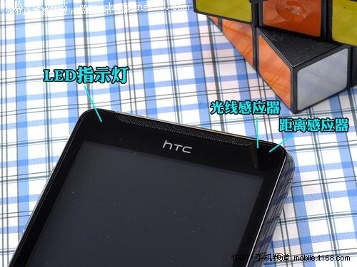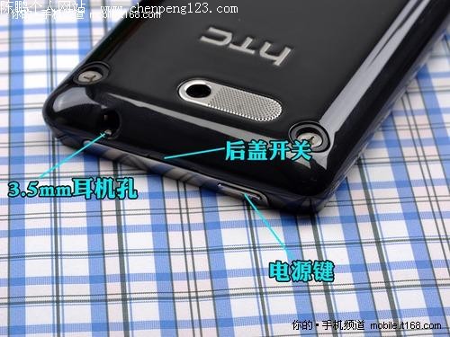 小巧紧凑的机身 在HTC的logo上方是该机夸张的长条形听筒,并且有金属网格覆盖,很好地保证了通话的质量,同时在听筒的旁边有一颗LED指示灯,右侧是距离感应器和光线感应器(照片上可能看不出来,太隐蔽了),至于前置摄像头嘛,自然还是被忽略了。