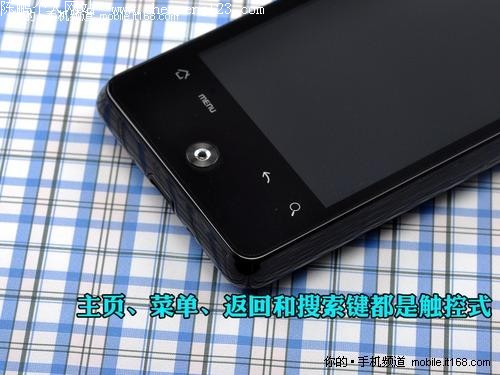 听筒设计和HD Mini完全一样 屏幕下方的主页键、菜单键、返回键和搜索键一字排开,而且都是采用触控式,有时候会造成误操作(比实体按键灵敏不少)。底部的光学感应器是HTC目前Android手机的标配,在网页浏览和打字的时候能起到一定的作用。