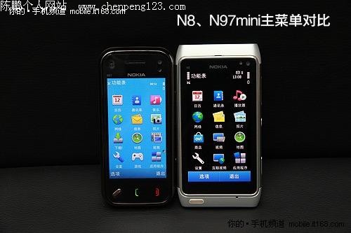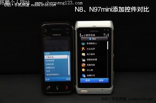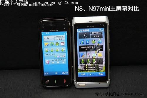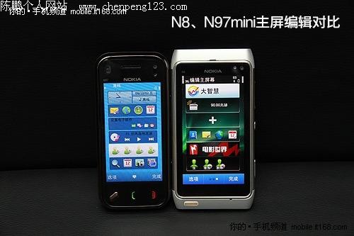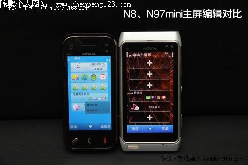 Symbian^3对比S60第五版---主屏幕 刚才,我们看到的是诺基亚N8单机界面,为了让你更为直观的了解Symbian^3与S60第五版之间的差异,笔者特别找来了N97mini进行对比,以下照片均按照N97mini(左)VS N8(右)的顺序介绍。
