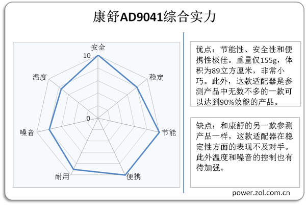 性能方面,康舒AD9041在20%、50%和100%三个负载下的效能均达到了90%以上,在节能性评比中折桂实至名归。另外,在安全性方面,这款适配器的EMI辐射和纹波抑制都名列前茅。