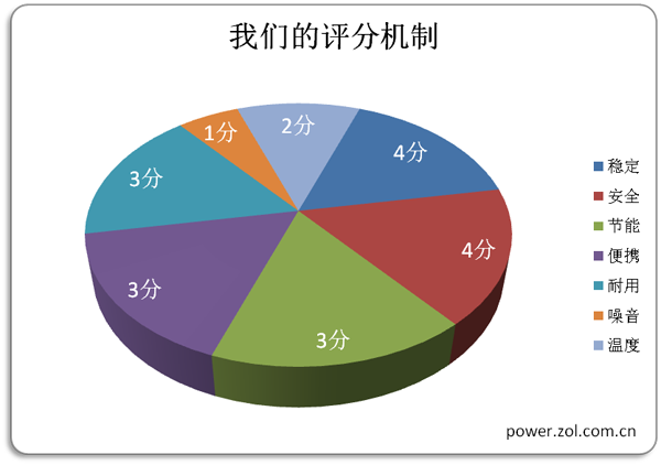 需要解释一下我们为什么以这样的比重来分配分数。对于用户而言,适配器的稳定性和安全性首当其冲,所以我们给予4分的最高分体现;便携和耐用性是由适配器的特性决定的,而节能性虽然对于用户的体验不够直接,但是低碳社会,节能为先,所以这3项我们均给予了3分的分值,给予重视。 另外,适配器的表面温度对于用户的影响相对较小,但是考虑到温度将会是产品用料以及耐用性的间接体现,所以我们给予了2分的分值。最后,笔记本适配器的噪音值一般都非常小,它的噪音只要是有内部电流的波动产生的,也能在一定程度上反映稳定性,所以我们将该项的满分设置为1分。