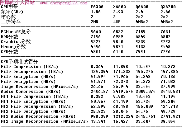 (一)测试平台 主板:技嘉GA-965P-DS4(P965芯片组) 显卡:技嘉GV-NX76T256D-RH 7600GT(256MB显存,无风扇静音版) 内存:威刚(A-DATA) DDR2-800 1GBx2(双通道模式) 硬盘:希捷Barracuda 7200.10 2块250GB,SATA II(RAID 0模式) CPU风扇:Intel E6300盒装风扇 操作系统:Microsoft Windows XP Pro+SP2补丁升级包(联想OEM版) Microsoft Windows Vista Ultimate (联想OEM版) (二)PCMark05测试结果 PCMark 05测试(含CPU子项目)测试结果表