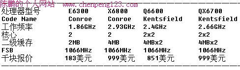 三、真实性能对比测试 看过INTEL官方网站的测试后,可能大家会觉得意犹未尽。因为测试是在三个不同时代的处理器之间展开的,可比性似乎较差。为检验Q6600四核心处理器的真实性能,笔者也试着将Q6600与同一时代的E6300(双核)、X6800(双核)以及QX6700(四核)处理器进行对比测试,相信更能体现Q6600四核心处理器的真正实力。感兴趣的朋友不妨作为参考。 首先,我们比较一下INTEL公司这四块最新款处理器的技术特点。 四款Intel处理器技术规格比较表