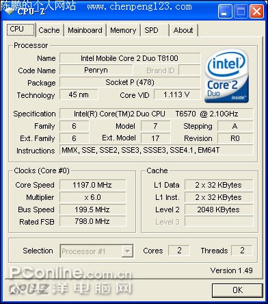 最特殊的中端45纳米:T6570 下面这款处理器是笔者最新看到的一款45纳米处理器,它出现在一款宏碁的主流笔记本上,但是当时笔记本上的贴标还是贴着T5800,但是处理器已经升级更换,相信这款处理器的出现也是相当突然,笔记本厂家还来不及更换机身上的贴标。 虽然软件对处理器的名称识别并不正确,但是由Specification型号当中,我们看到了这款处理器的型号应该是:Intel Core2 Duo(Penryn) T6570,主频为2.1GHz,刚好位于T6400与T6600之间。同样采用了45纳米的Penryn核心,800MHz前端总线,2MB二级缓存。 这里笔者的最大疑问是这款处理器的参数与T6400以及T6600均相同,而主频也正好位于T6400(2.0GHz)以及T6600(2.2GHz)之间,为什么型号上却并不是T6500呢?而以往英特尔已经推出过多款带有“70”数字结尾的处理器,相比其它型号增加了VT技术(虚拟化技术)的支持,但是实际应用中并没有差距。关于以上内容大家可以另外参考《谁说商务不能时尚 Thinkpad SL500简单评测》一文。