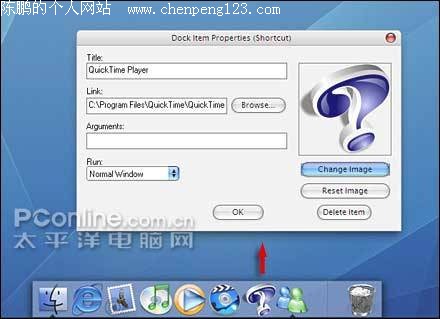三、 更多新鲜体验 怎么样?看了这么多漂亮的图片, 您是不是也已经动心了呢?别急,其实在FlyakiteOSX美化过的系统中,还有不少“另类”的玩法,下面咱们就一起去见识一下吧。 1. 自定义Dock工具栏 相信不少朋友已经注意到屏幕下方那个Dock工具栏了。可以说,它现在已经成为苹果系统的一个标志了,作用就相当于WinXP中的快速启动栏。虽然,这里默认已经安装上了不少程序,但显然,其中很大一部分都不是我们所需要的。不过别急,在FlyakiteOSX中,我们同样可以很方便地对Dock工具栏重新定义。 其实,要将新程序添加到Dock工具栏上特别简单,只要我们将这些程序的快捷方式拖拽到工具栏中即可。当然,如果您对默认的工具栏布局还不满意,也可以直接使用鼠标拖动调节。甚至,当我们右击工具栏上的某个图标时,还可以使用“Dock Entry Properties”命令对其进行更详细的设置,非常方便,如图13所示。