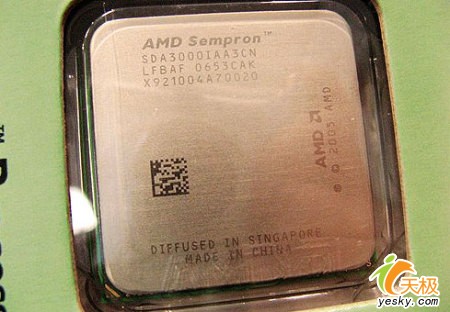 AMD Sempron 3000+采用90纳米工艺制程,实际主频为1.6GHz,外频为200MHz,倍频为8,支持MMX、SSE、SSE2、SSE3以及X86-64指令集,此外产品还支持DDR2-800双通道内存,且功耗仅为62W TDP。处理器编号从上到下依次为“SDA3000IAA3CN”。其中“SDA3000”代表桌面用Sempron 3000+处理器,字母I代表Socket AM2接口;字母AA代表支持自动温控调节技术;数字3代表256KB二级缓存;字母CN代表为Manila核心。