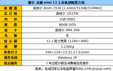戴尔Inspiron(灵越) mini 12(S510513CN)配备英特尔Atom Z530处理器(1.6Hz/512KB/533MHz)、1GB DDR2内存、80GB SATA硬盘。目前,该机型的官网售价为3999元。