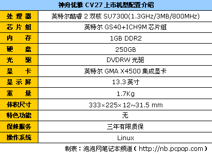 编辑点评:神舟优雅CV27搭载英特尔酷睿2双核SU7300处理器、1GB内存、250GB硬盘、13.3英寸液晶显示屏,今天神舟对该产品进行降价,直降400元,非常划算。