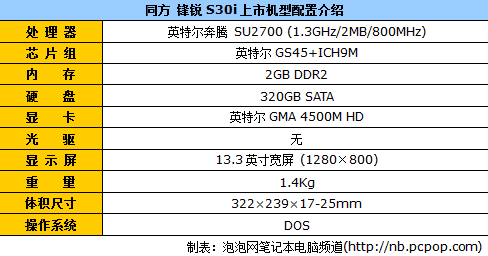 清华同方锋锐S30i-15配备英特尔奔腾SU2700处理器(1.3GHz主频/2MB二级缓存/800MHz前端总线)、英特尔GS45+ICH9M芯片组、2GB DDR2内存、320GB SATA硬盘。目前,该机型的经销商价格为4699元。