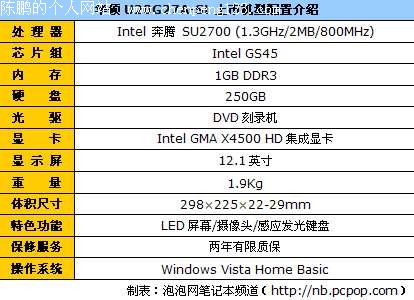 华硕U20G27A-SL采用12.1英寸宽屏幕设计(LED背光模组),配备了Intel Pentium ULV SU2700处理器(1.3GHz主频/2MB二级缓存/800MHz前端总线)、Intel GS45芯片组、1GB DDR3内存、250GB硬盘、DVD刻录光驱和Intel GMA 4500MHD集成显卡。目前,它的经销商报价为5347元,近期货源比较充足。