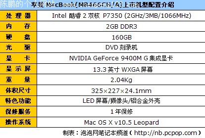苹果MacBook(MB466CH/A)采用13.3英寸宽屏幕设计,配备英特尔酷睿2双核P7350处理器(2.0GHz主频/3MB二级缓存/1066MHz前端总线)、2GB DDR3内存、160GB硬盘、DVD刻录光驱和NVIDIA GeForce 9400M G集成显卡。目前,它的经销商报价为7700元。