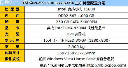 ThinkPad SL500 2746AD6采用Intel 赛扬双核 T1600处理器(1.660GHz主频/1024KB二级缓存/667MHz总线)、1GB内存、250GB硬盘、集成Intel GMA 4500M 高性能显卡以及分辨率为1280×800的15.4英寸显示屏。