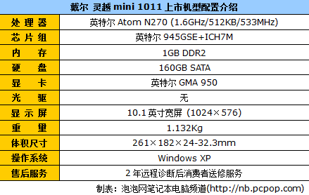 戴尔Inspiron灵越mini 1011(S510501CN)配备英特尔Atom N270处理器(1.6GHz/512KB/533MHz)、1GB DDR2内存、160GB SATA硬盘。目前,该机型的售价为2950元。