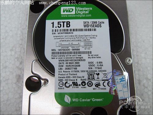 西部数据 Caviar Green 1.5TB SATA2 32M(WD15EADS)拥有1.5TB容量,单碟容量为500GB,提供了32MB高速缓存容量。