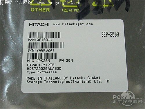 日立 2TB(HDST722020ALA330)转速为7200RPM,采用SATA2.5接口,拥有32MB缓存,产地为泰国,由于使用了液态轴承马达,硬盘工作时噪音在26至28分贝之间。