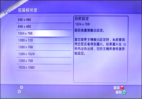 使用VGA端子信号线的话,进入Xbox360系统界面后可以在“系统 - 主机设定 - 显示”菜单下调节分辨率。这里特别需要注意,部分游戏如果使用不恰当的分辨率则会导致画面拉伸变形,比如玩《世界街头赛车3》,必须采用“640X480”或“1024X768”,如果使用其他分辨率则会导致画面变形;但在《生与死沙滩排球2》中选择以上两种分辨率的话,则反而会使画面拉伸;大部分游戏都会提供多个分辨率支持,所以不必多虑,遇到画面拉伸情况则进入系统菜单重新调节分辨率即可。