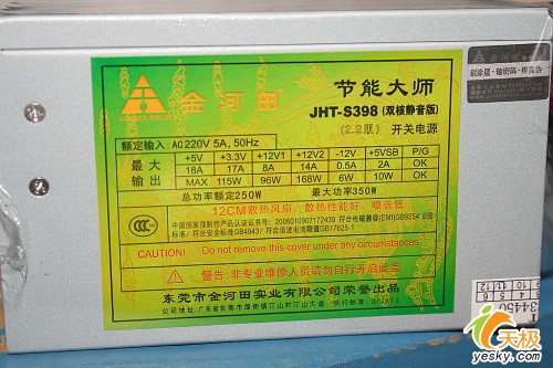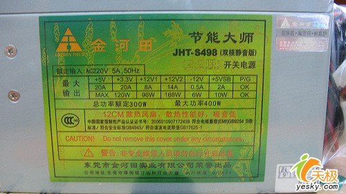 功耗问题,产品铭牌有特别的标注。金河田JHT-S498,使用了国内现今水平的节能芯片,融合专利技术。在关闭电脑时会自动关闭接在该接口上的所有设备的电源,可以最大限度的做到省电。而且,待机功耗低至1W,符合全球最严格的欧洲节能认证要求。其转换率在80%左右,超过国家规定的65%的平均水平,大大节约了电能。