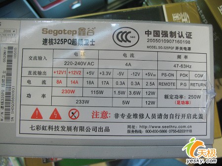 电源铭牌对相关参数细节都予以标注,速核325PQ超频卫士的额定功率为250W,能满足普通赛扬D用户的选择搭档,家庭应用和办公使用绰绰有余。双路+12V输出,总输出电流达到22A,符合Intel ATX 12V Ver2.2标准。