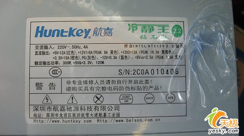 清晰的参数铭牌,额定功率300W。双路+12V输出电流分别是9A和13A。负责USB供电的+5Vsb电流为2.5A,峰值3.5A,对电脑的周边外设和数码产品联机提供了更强有力的供电保障。