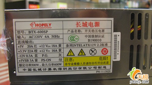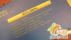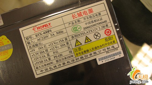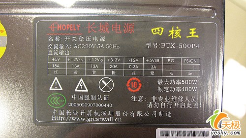 长城双动力BTX 500P4,也是烤漆外壳,散热风扇横吹,侧面预留风道。额定功率400W,最大功率500W。虽然外观二者相同,不过重量上确实超出了许多。估计,内部电路板设计和电子器件的型号,会有一定的差异。长城双动力BTX 500P4同样也是标准ATX 12V 2.2版产品,拥有2组+12V输出分别针对CPU和I/O。