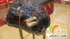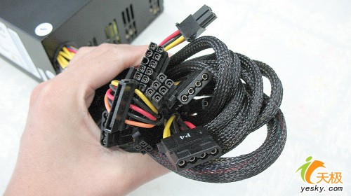 黑旋风的接口相当丰富,拥有6个D型接头、1个软驱电源接头、两个5pin SATA接头和两个小4pin接头,同时两个小4pin可以组合成一个8pin接头,兼容最新的SLI和交火主板,而主板电源接头采的是20pin+4pin的设计,这样的配置不仅适应中高端PC的需求,也符合服务器应用的规格。输出线缆加装有尼龙网,起到防磁屏蔽的作用。电源表面的用料,全汉十分严谨。