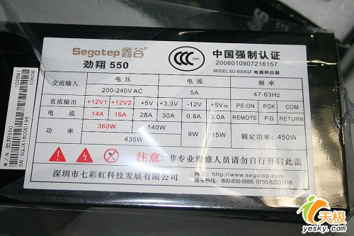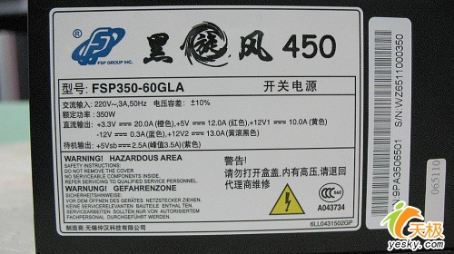 功率铭牌上我们能够看到,这款电源的额定功率为350W,最大输出功率为400W。+12V的处理器部分提供了15A的输出,而+12V的I/O部分达到了10A。二者合计为180W+120W=300W。对付PD、8800GTS还是能够应对的。
