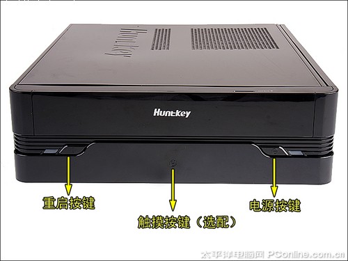 航嘉 魅影二H921机箱的开关按键和重启按键设置在前面板的左右两侧,采用了对称式设计,且大小和颜色均相同,搭配面板中部的纹路设计颇有层次感。另外,用户还可以在面板中部选配更方便的感应式延迟开关电源键。