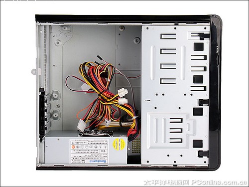 打开航嘉 魅影二H921机箱的侧板,我们可以看到机箱内部空间设计较为紧凑,由于采用的是Mirco ATX结构,所以只能安装Mirco ATX结构的主板和电源,提供了一个光驱安装位和一个硬盘安装位。