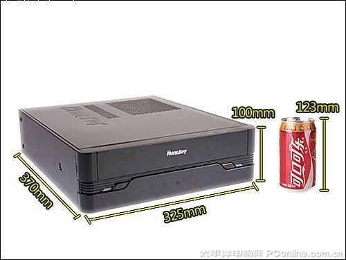 航嘉 魅影二H921机箱尺寸为370(L)mm×325(W)mm×100(H)mm,对于一台Micro ATX机箱来说并不是很大。从上图可以看到,卧式摆放时的高度比一个正常的可口可乐罐的高度还要稍低一点。