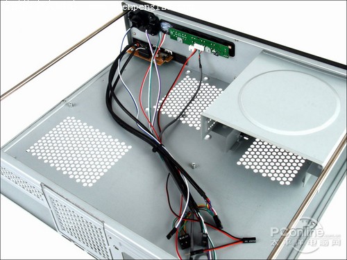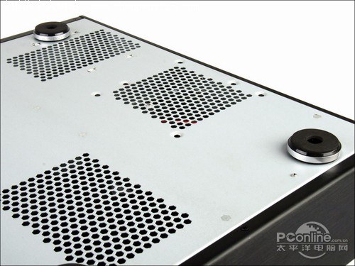 在先马 HTPC-Q1机箱底部的CPU、显卡等热量较大的位置上,设计有3个大面积散热孔,并采用蜂窝式设计可以有效屏蔽EMI电磁辐射,另外还预留有一个12CM的风扇安装位。