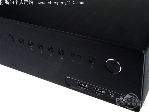 先马 HTPC-Q1机箱前面板右边除了具有一个金属质感包圈的圆形大开关外,还设置有一排多媒体功能按键和电源灯、硬盘灯。而两个USB接口和音频接口则设计在右下角的位置,并采用金属线包围的设计。