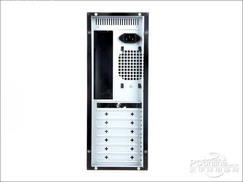 从动力火车 智眩316机箱尾部可以看见,该机箱拥有7条PCI槽设计,但显卡方面需要选择MINI设计的,稍微有点苛刻。另外机箱尾部同样设计有一个风扇安装位,加强机箱内部散热。