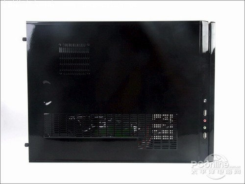 动力火车 智眩316机箱左侧侧板上的CPU位和显卡位上设计有大面积的栏栅散热孔,并且CPU散热孔支持安装8CM风扇。