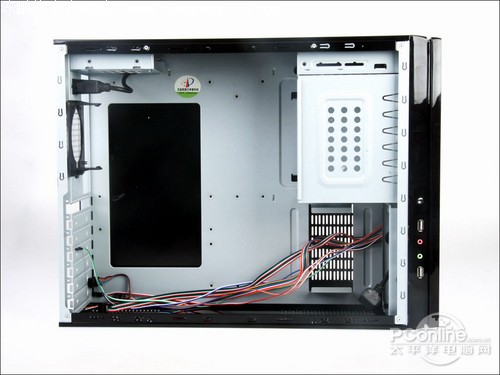 动力火车 智眩316机箱内部宽敞通风透气,在原电源安装位上设计有一个3.5英寸的安装位,电源安装位则移至机箱前部。共拥有两个3.5英寸硬盘安装位(包括后部一个),还有两个5.25英寸光驱安装位,支持免螺丝安装。