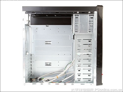 打开技展 彩钢八号机箱的侧面板,可以看到机箱内部设计比较中规中矩,采用标准ATX架构,可以支持ATX/M-ATX主板的安装。并且四周的边框上设计有大量EMI防电磁辐射弹点,可以有效防止电磁辐射外泄。提供了3个5.25英寸光驱安装位和7个3.5英寸硬盘安装位,在光驱和硬盘位的设置上来说还是比较丰富。